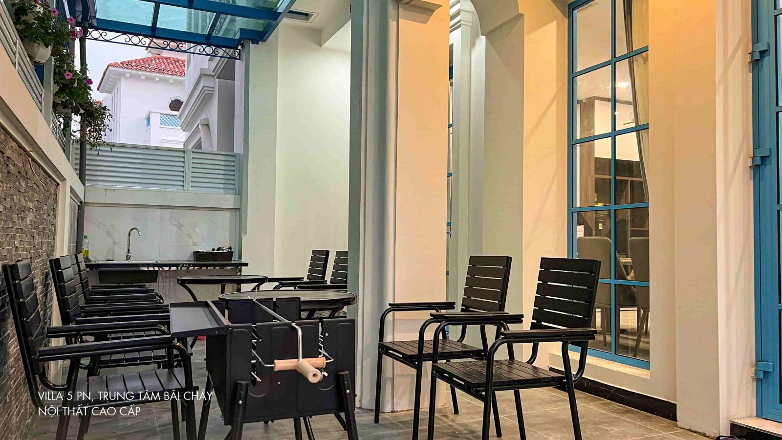Diện tích 180m2, sân vườn xanh mát tạo cảm giác thư thái, không khí biển trong lành có bàn ghế ăn, bếp nướng BBQ ngoài trời