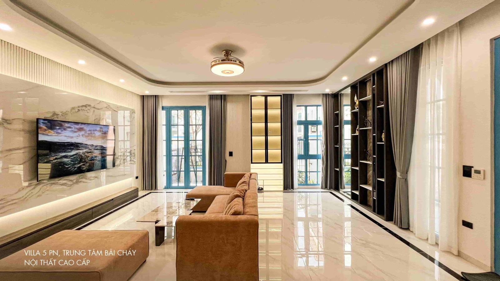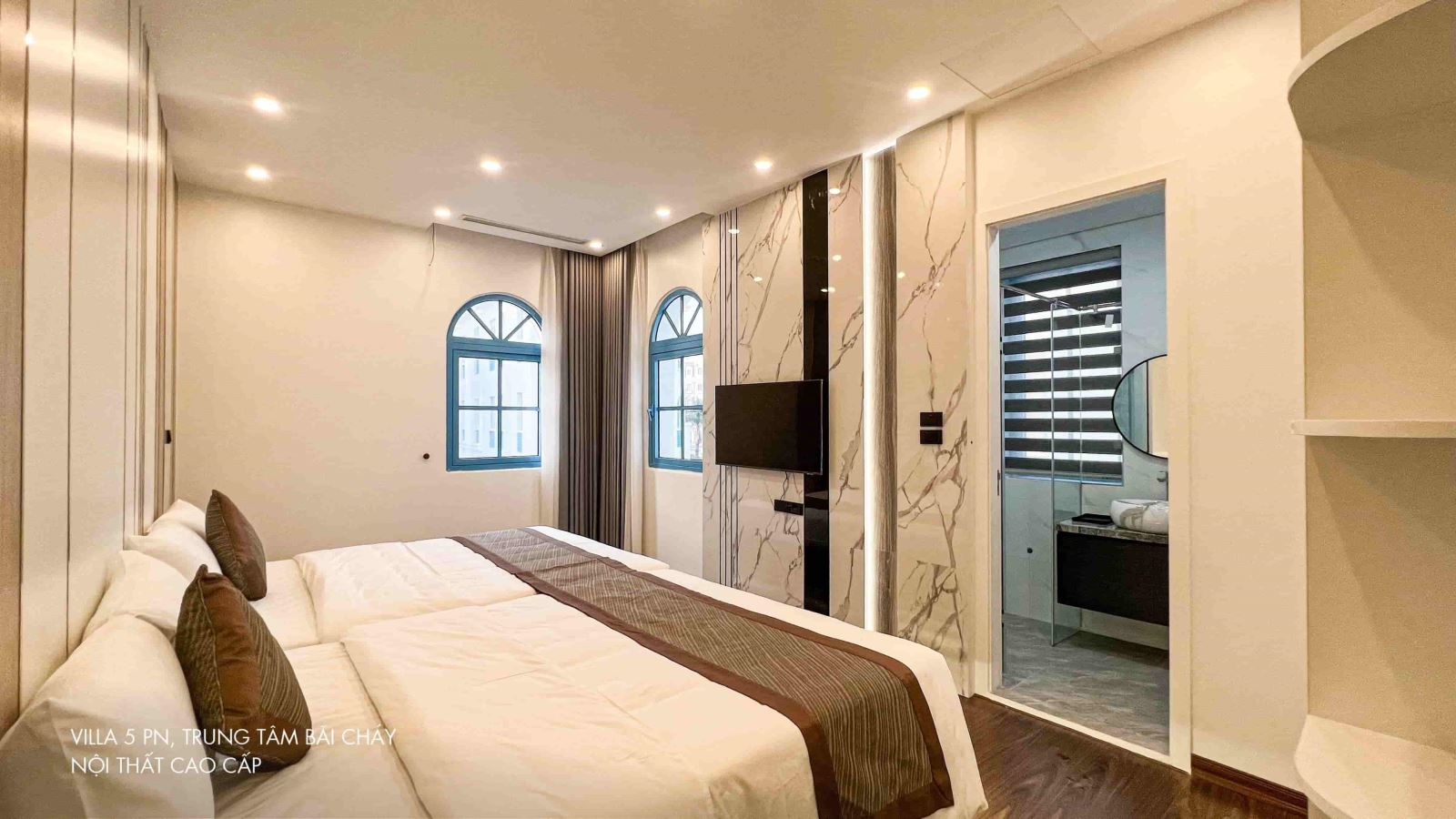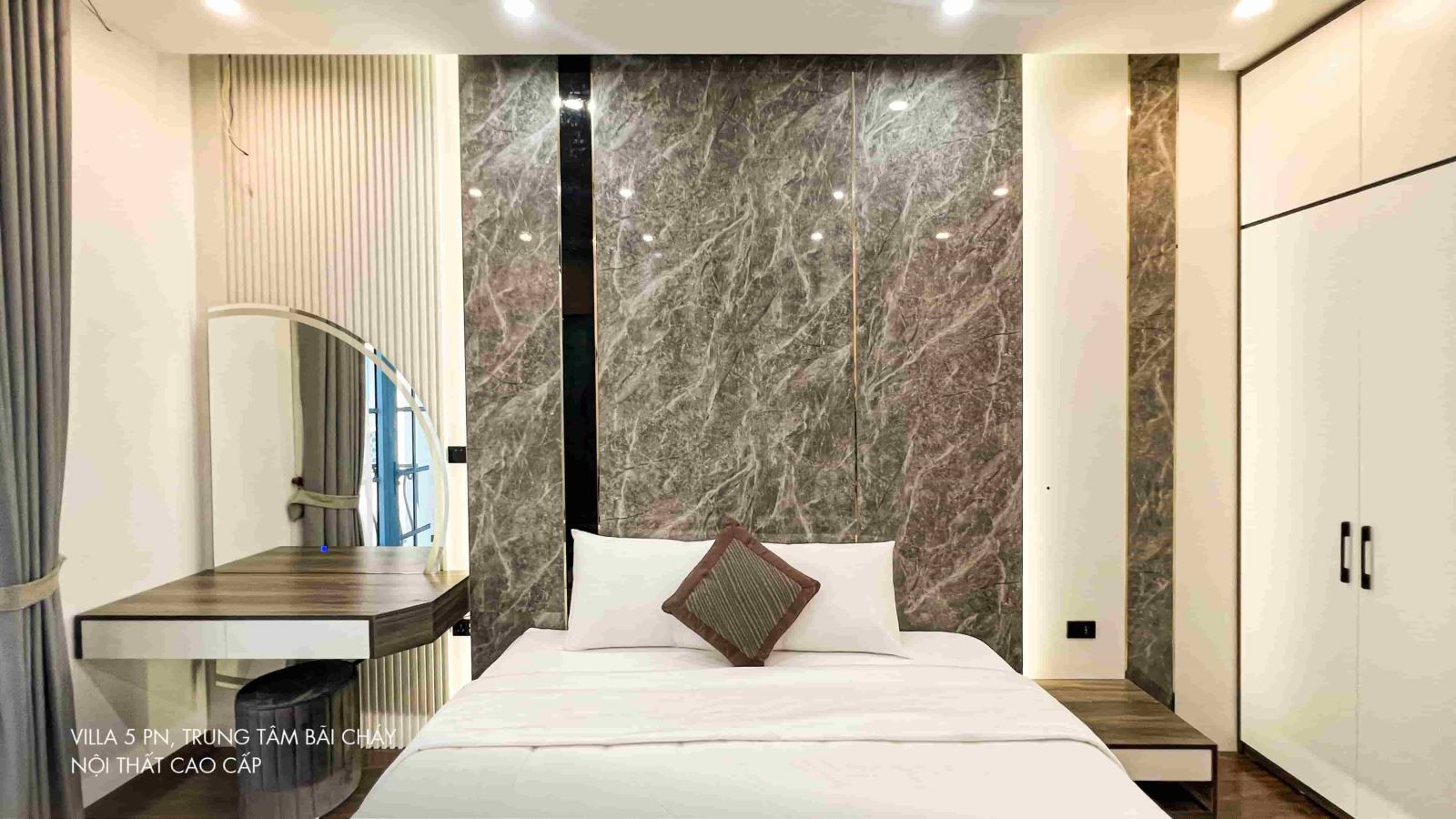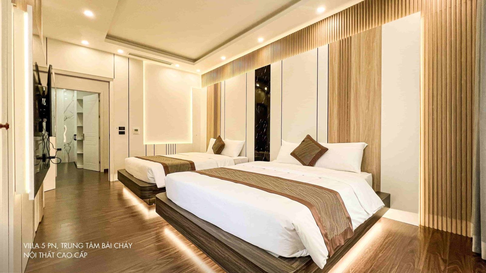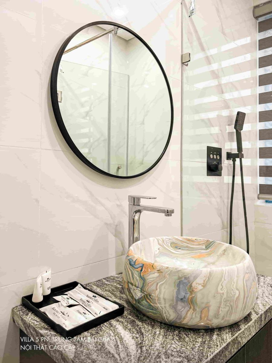 Biệt thự có 05 phòng ngủ đầy đủ tiện nghi (TV, WC khép kín, Wifi, máy sấy, đồ vệ sinh cá nhân …) với kích thước gường: 03 phòng gường 1,8m, 01 phòng 02 gường 1,6m, 01 phòng 02 gường 1,5m, 06 phòng tắm đầy đủ tiện nghi