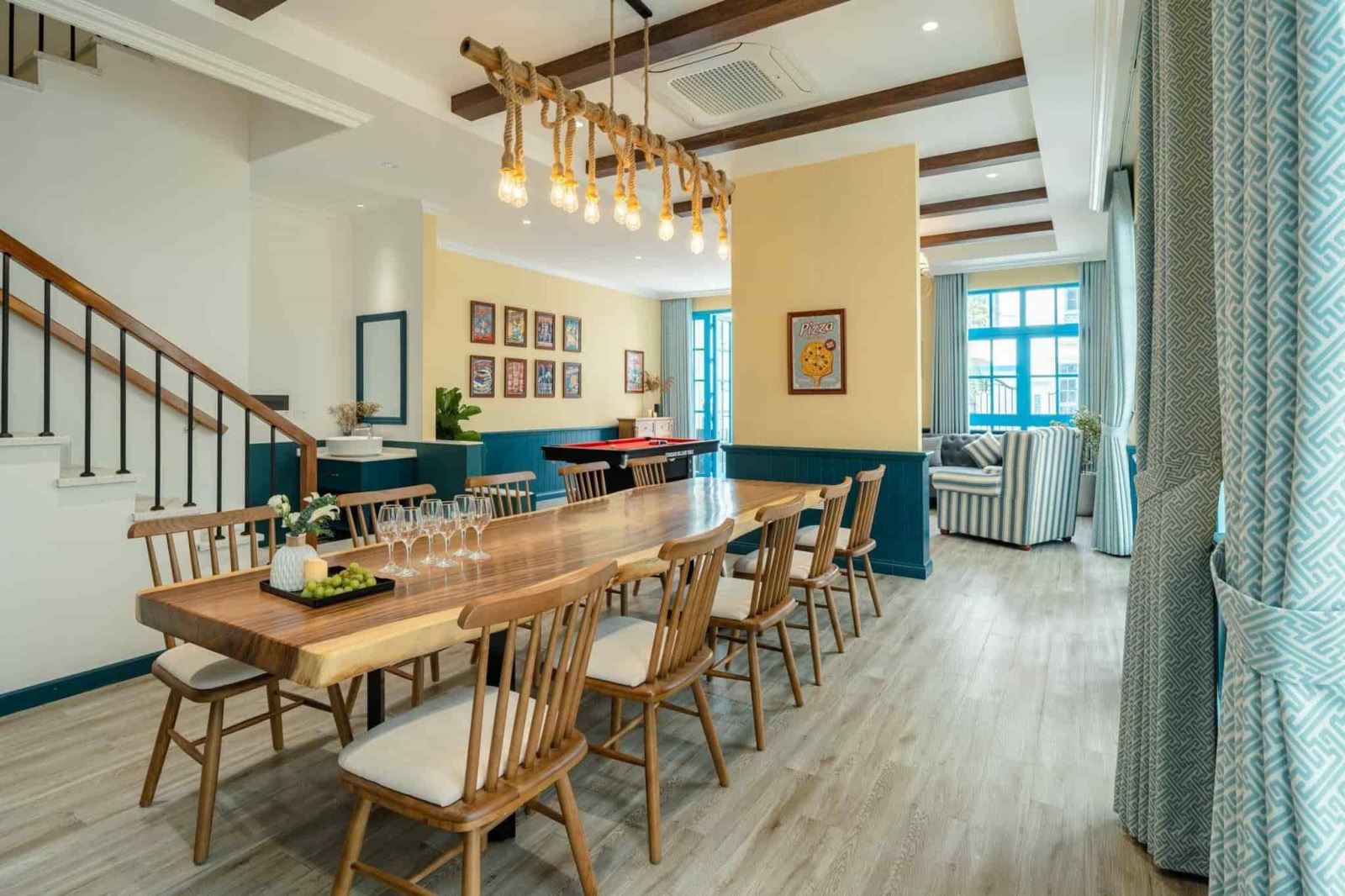 Tầng 1: phòng khách, bếp, bàn bi-a